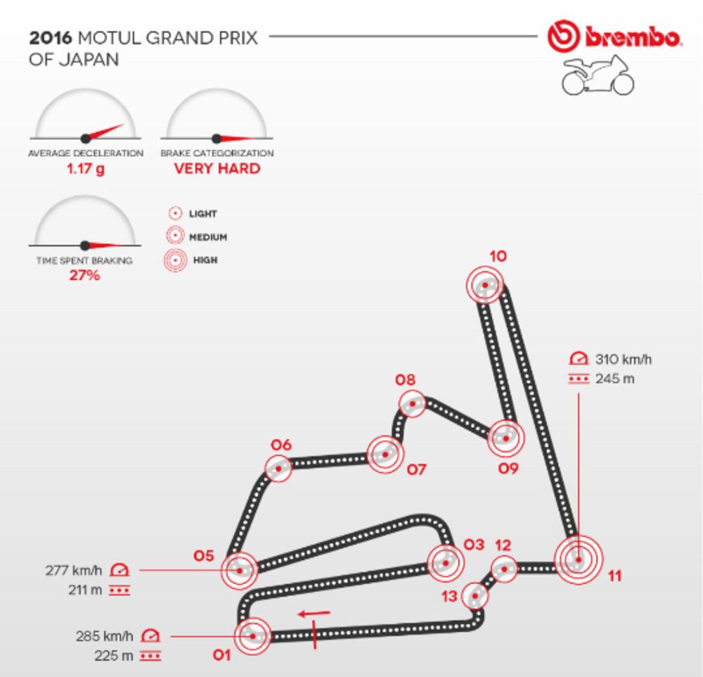 Dari 11 sesi pengereman di Twin Ring Montegi, hanya satu yang dianggap paling menantang untuk rem, enam lainnya masuk kategori medium dan empat lagi di anggap ringan.